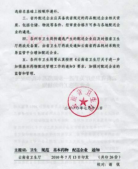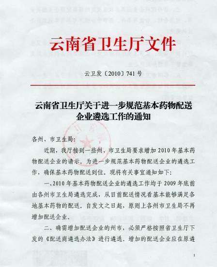 2010年云南省衛生廳關于進一步規范基本藥物配送企業遴選工作通知